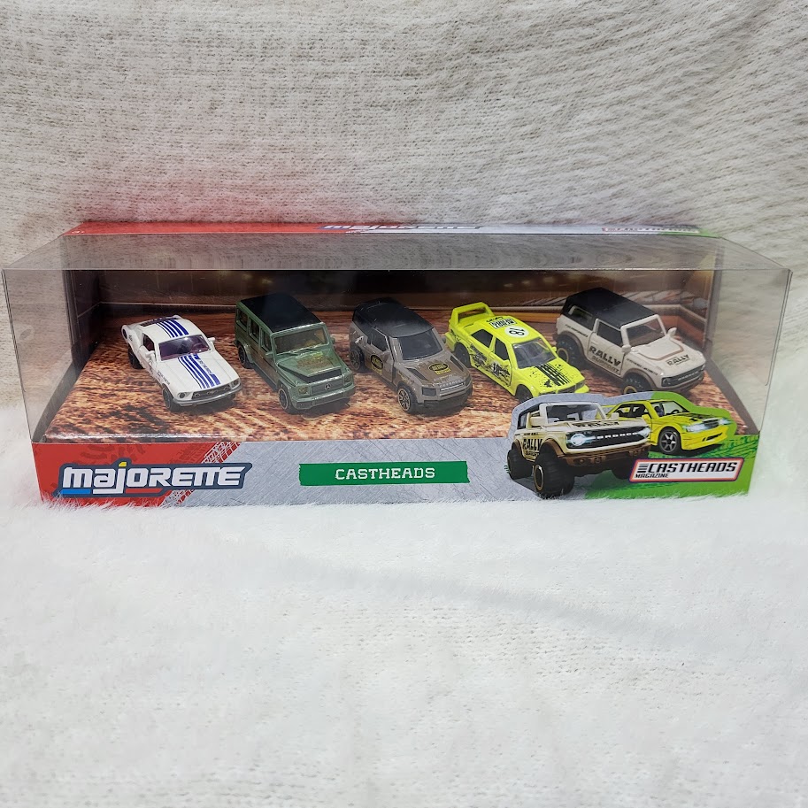 • This set includes Ford Mustang Fastback, Ford Bronco Wildtrak, Land Rover Defender 90, Mercedes-Benz 190E 2.5-16 EVO II, and Mercedes-Benz G 500.